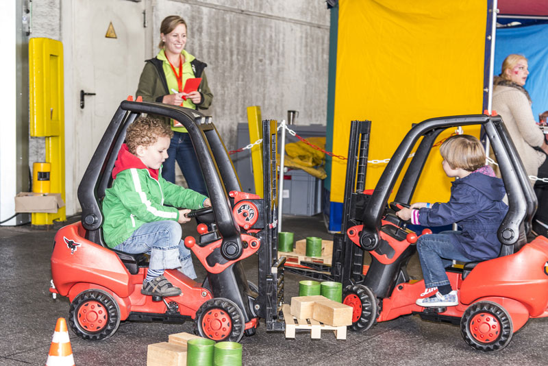Der Parcours mit unseren Gabelstaplern für Kinder darf auf keinem Firmenevent fehlen. Hier dürfen die jungen Eventgäste „schweres Gerät“ bedienen und bei verschiedenen Übungen ihr Geschick beweisen. Die Gabelstapleraktion für Kinder kommt mit den Mini-Gabelstaplern, viel Zubehör (kleine Lagerregale, Paletten, Kisten und Dosen) und Personal zu Ihnen. Es gibt viel zu tun, bei dieser Aktion. Paletten müssen hin und hergefahren werden oder ins Regal gestellt werden. Andere Paletten müssen aber dafür erst aus dem Regal geholt werden. Auf der Aktionsfläche dieser tollen Eventaktion ist immer was los, und alle Fahrer bekommen nach er erfolgreichen „Abschlussprüfung“ einen Führerschein, als Andenken. Sie können diese Führerscheine auch mit einem Logodruck bei uns buchen.